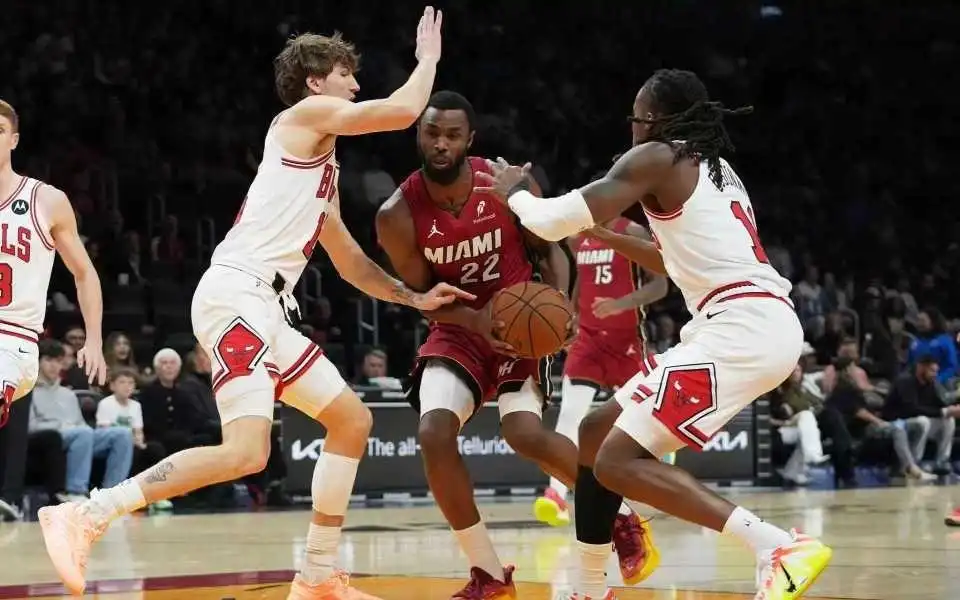 热火上一场客场116-113险胜公牛,公牛过去3场连输湖人、步行者与热火遭遇3连败,本赛季前两次交锋热火均客场战胜公牛。本场热火缺少鲍威尔、希罗、米切尔与罗齐尔,公牛缺少吉迪、怀特、武切维奇等。首节前4分半钟热火3-12落后,热火连追5分,公牛连得4分。热火持续反扑追到17-20落后,卡特三分命中,维金斯三分回敬,公牛内外开花扩大9分优势。热火再追3分,首节结束热火25-31落后公牛。首节公牛24中12,其中三分11中4,热火26中9,其中三分12中3。
