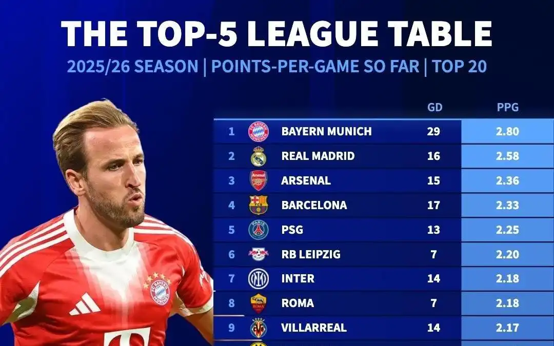 在本周末五大联赛战火重燃之前,《德国转会市场》统计了本赛季五大联赛球队场均拿分的榜单,拜仁领跑,皇马紧随其后,阿森纳排在第三。