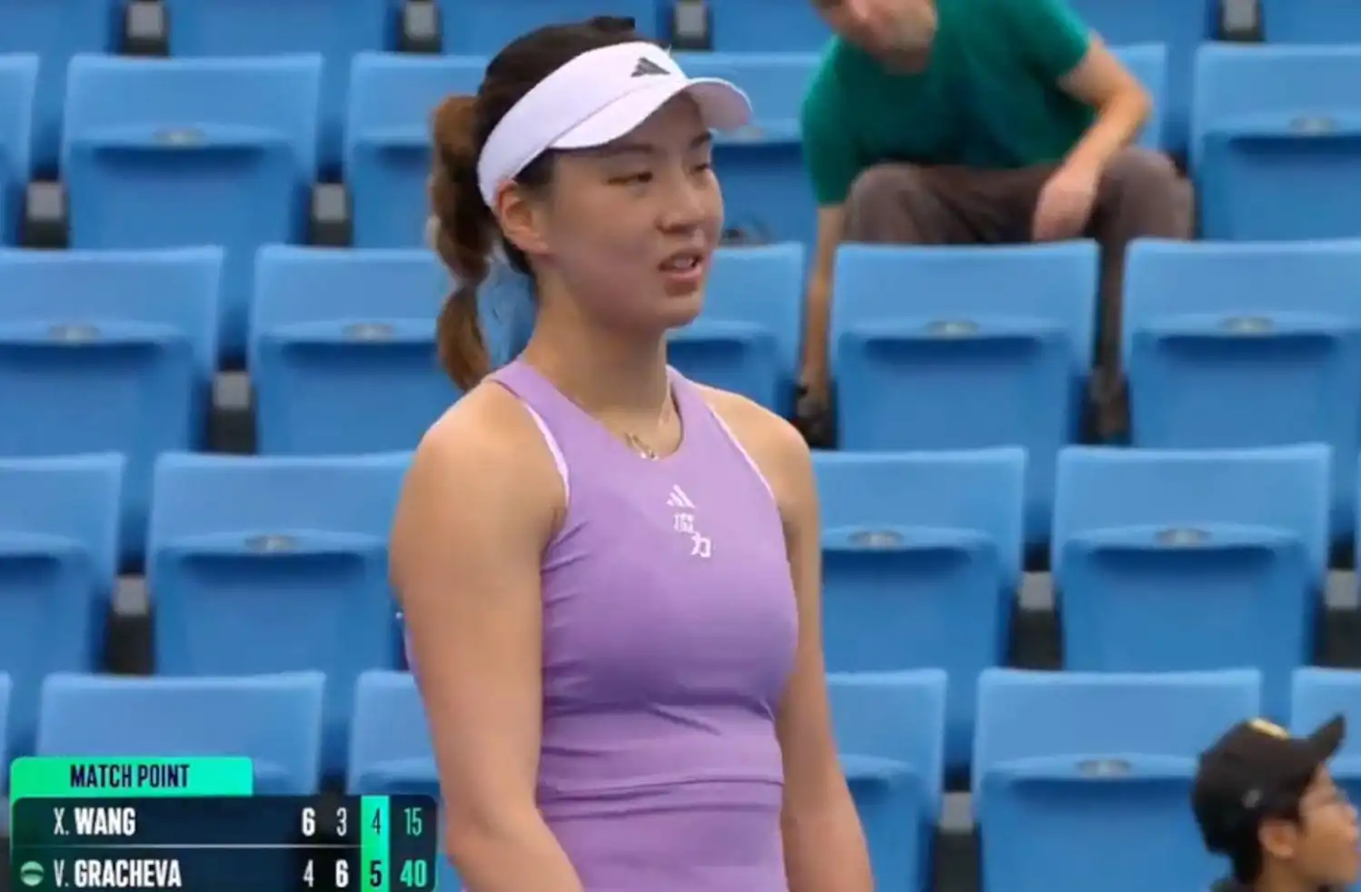 第三盘,两位选手开始决战。前9局结束,王欣瑜4-5落后。第10局,格拉乔娃的发球局。局分30-15的时候,王欣瑜回球,打在界内,但主裁判再次判罚出界。王欣瑜立刻提出抗议。